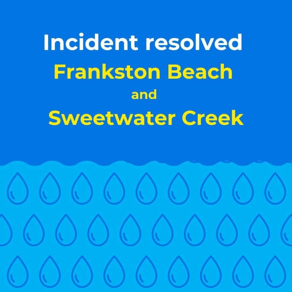 - Update: South East Water has advised that water quality test results confirmed it was safe to resume normal activities, including swimming at Frankston Beach and Sweetwater Creek.