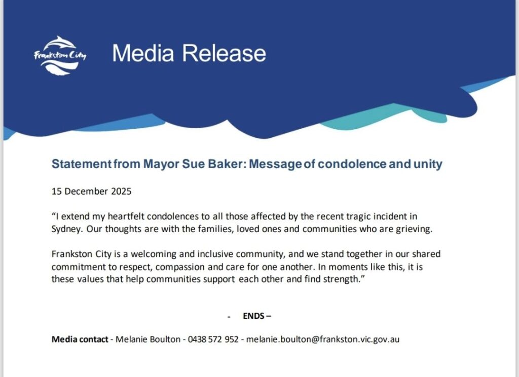 In a statement published by Frankston City Council on Monday 15 December 2025, Mayor Baker said her “heartfelt condolences” were with those affected, and that the city’s thoughts were with “families, loved ones and communities who are grieving”.