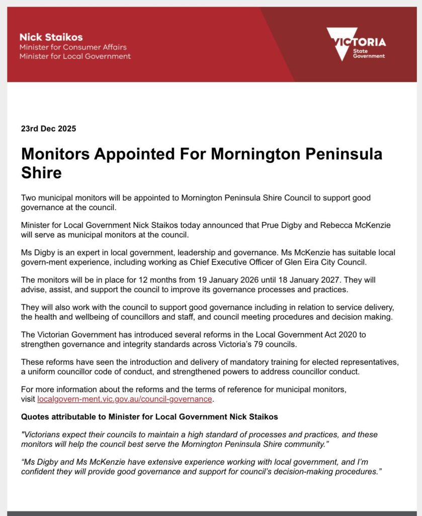 STPL News has contacted the Minister for Local Government’s office and Mornington Peninsula Shire Council seeking confirmation, including the scope of the monitors’ roles, the duration of the appointments, and whether any reports will be made public.