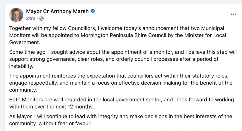 The appointment of two municipal monitors to Mornington Peninsula Shire Council comes after a mayoral term marked by sustained controversy, internal division and repeated public denials of governance concerns, despite months of reporting by STPL News and confirmed state intervention.